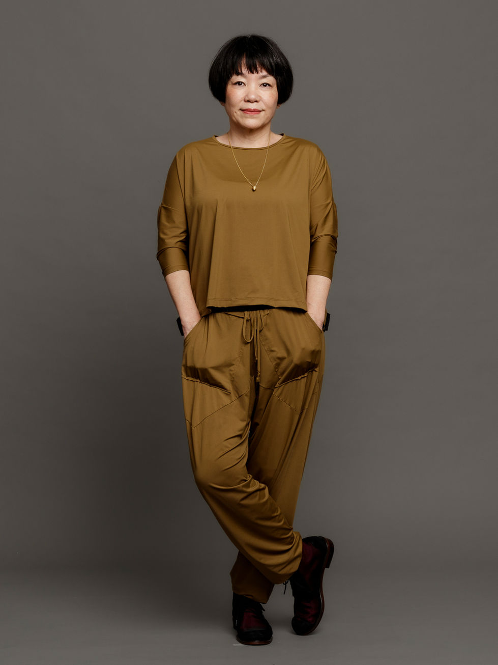 Tecido com toque fresco e caimento fluido, em malha compacta de elastano e poliamida biodegradável.